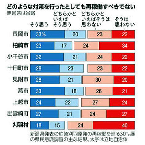 「どのような対策を行ったとしても再稼働すべきでない」との設問に「そう思う」「どちらかといえばそう思う」と回答したのは、長岡市と小千谷(おぢや)市が最多で計53%。