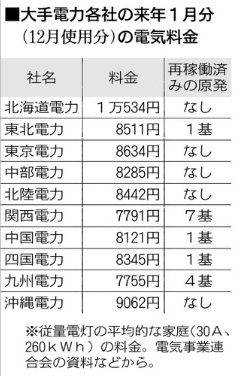 大手電力の家庭用の料金を比べると、北電は他社より