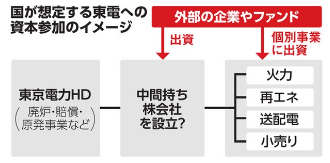政府は、東電の電力小売りや、送配電、再生可能エネルギーなどの事業子会社を束ねる