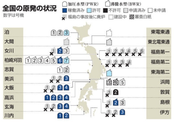 全国にある原発36基(建設中を含む)のうち、再稼働したのは15基。 東日本では、