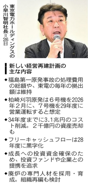 東京電力ホールディングスの新たな再建計画が26日、政府から認定された。柏崎刈羽原発(新潟県)が再稼働しても経営は苦しく、福島第一原発の事故処理費用が膨らむリスクも強まっている。東電は、他社との提携を通じた事業成長に望みをかけるが、実現するかは不透明だ。